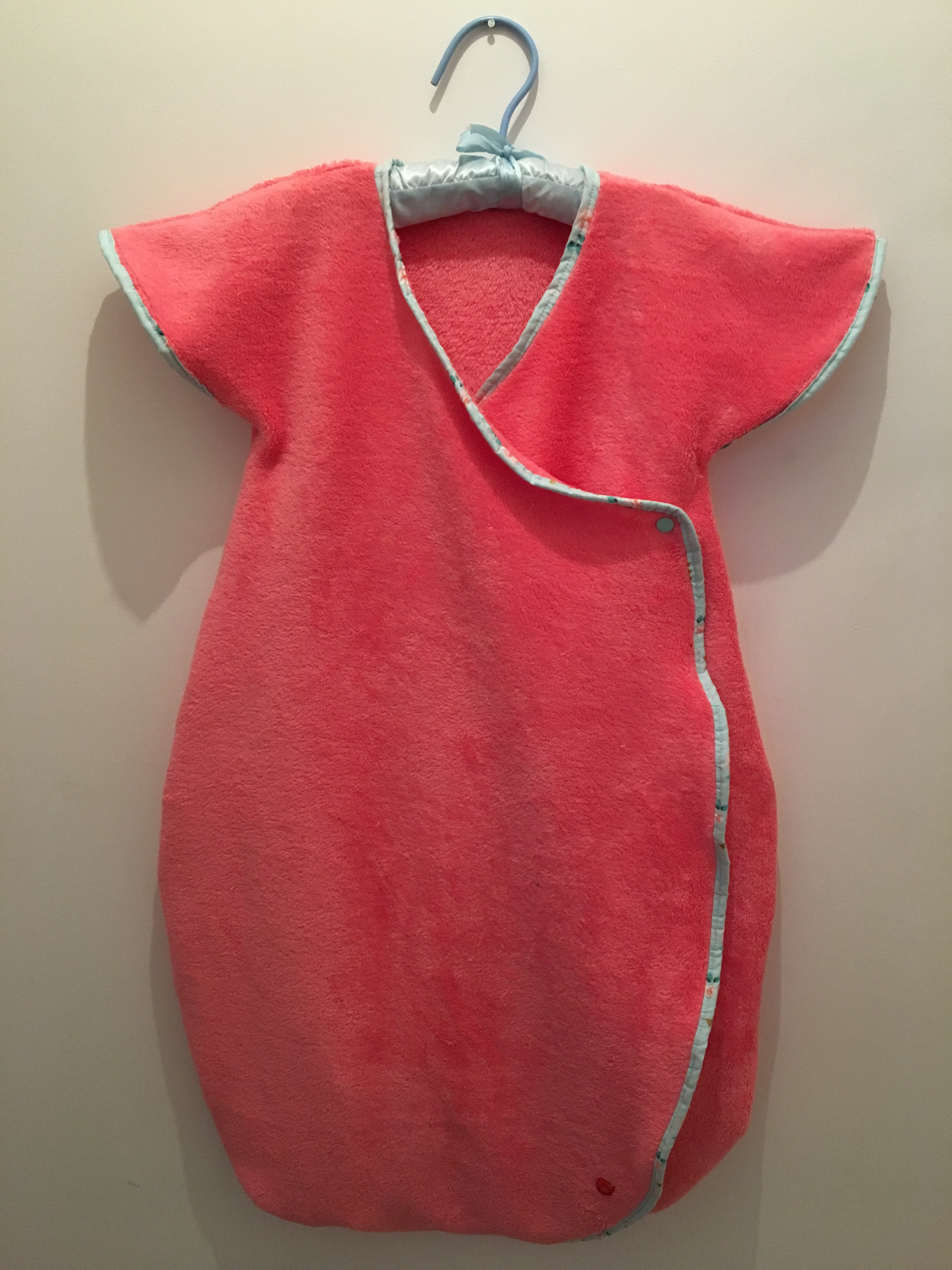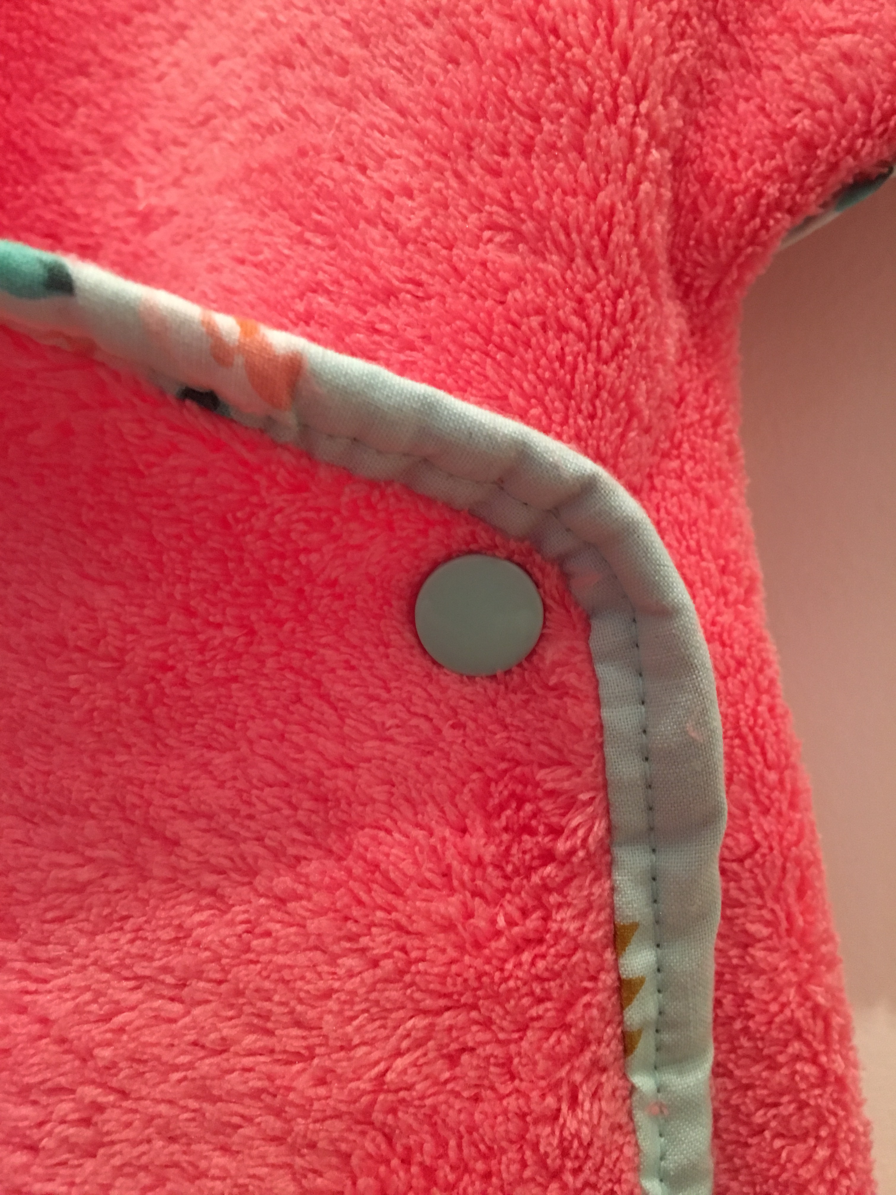 Le tissu teddy provient d’un énorme coupon que j’avais acheté aux Coupons de Saint-Pierre et que j’ai déjà utilisé ici. Le biais est fait maison et provient d’un coupon que j’ai transformé en biais parce qu’il ne me restait pas grand chose d’autre à en faire, j’avais utilisé le tissu pour cette robe. Comme je manquais de biais, j’ai simplifié le modèle au maximum en remplaçant les liens par des pressions Kam.