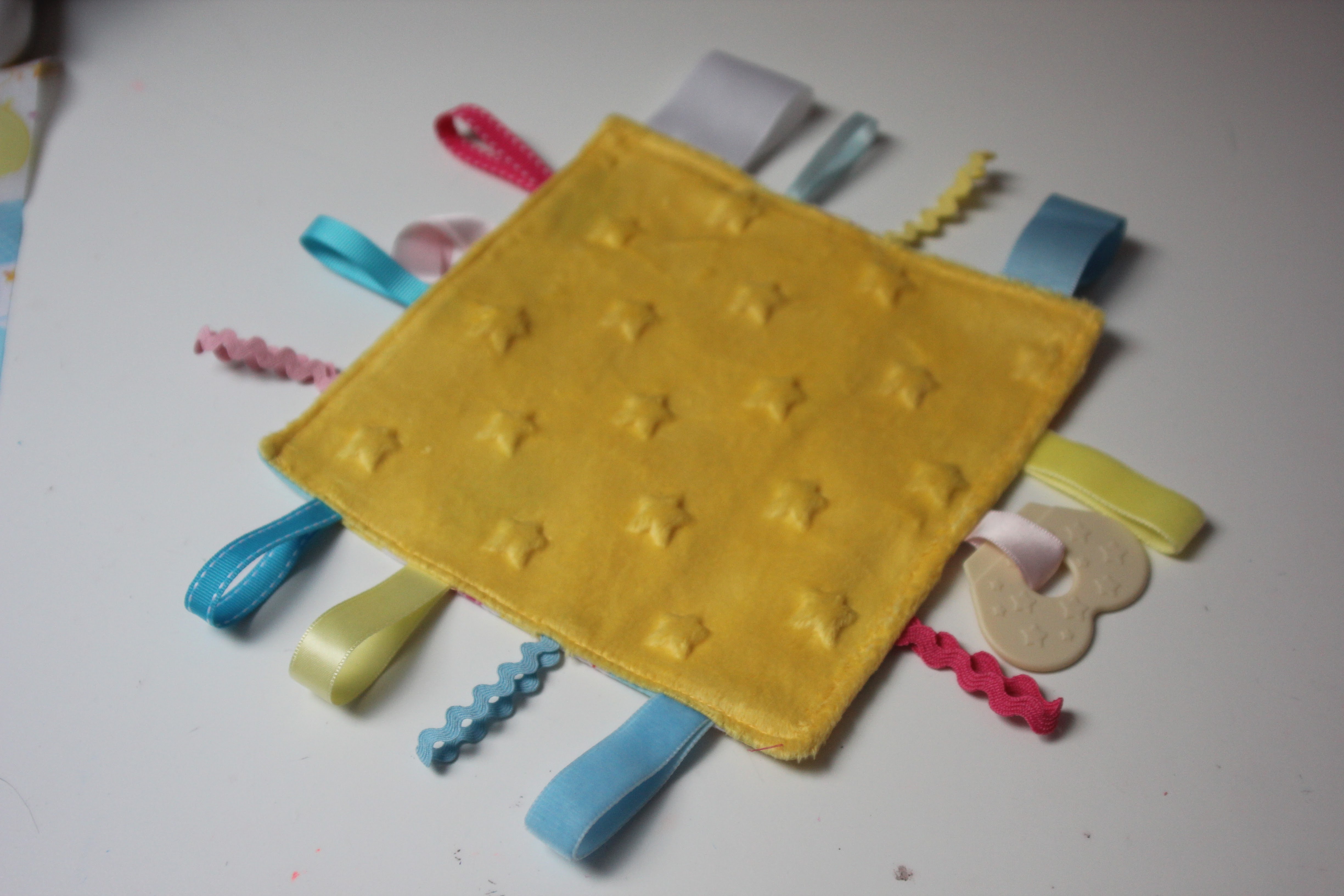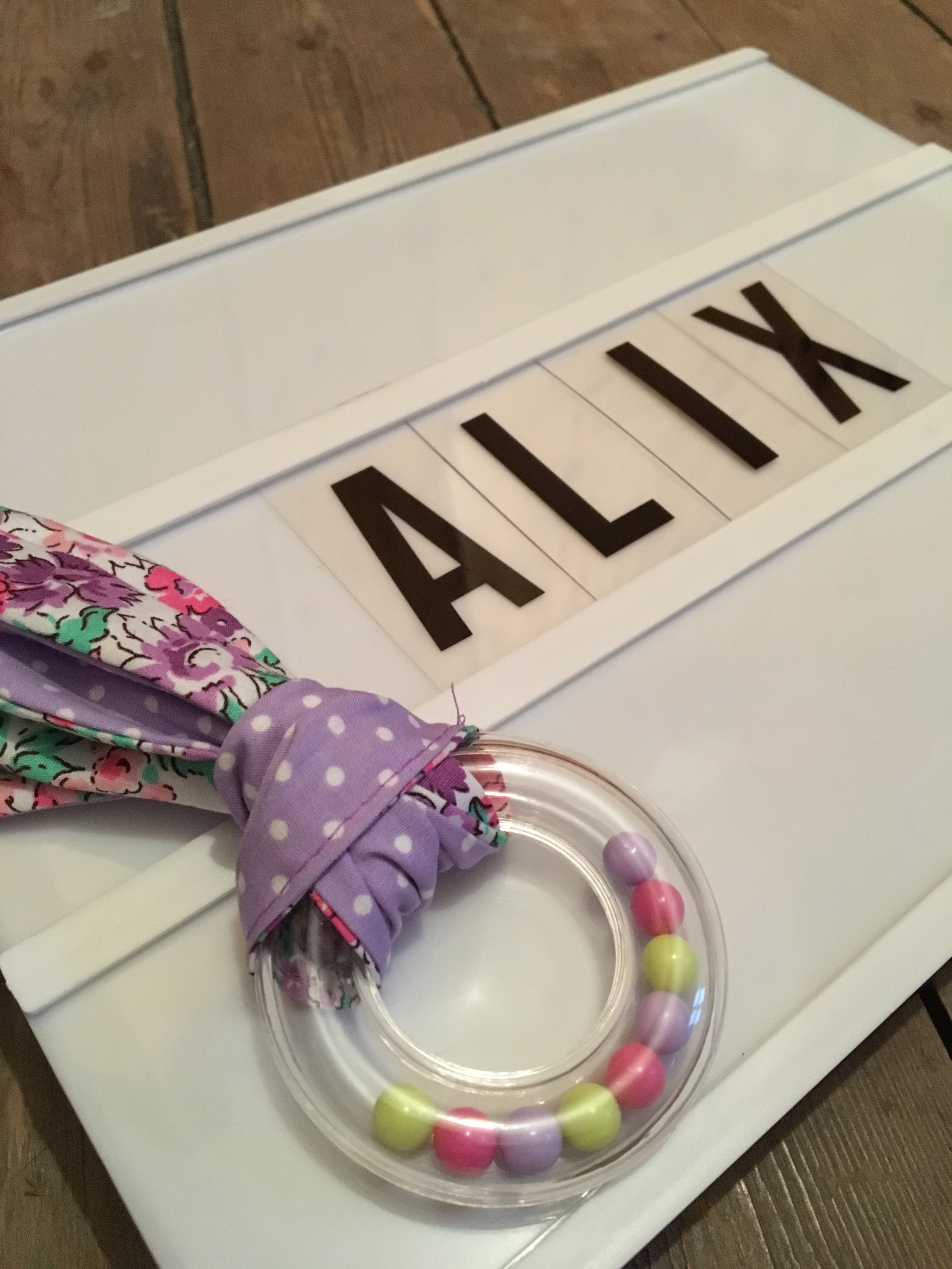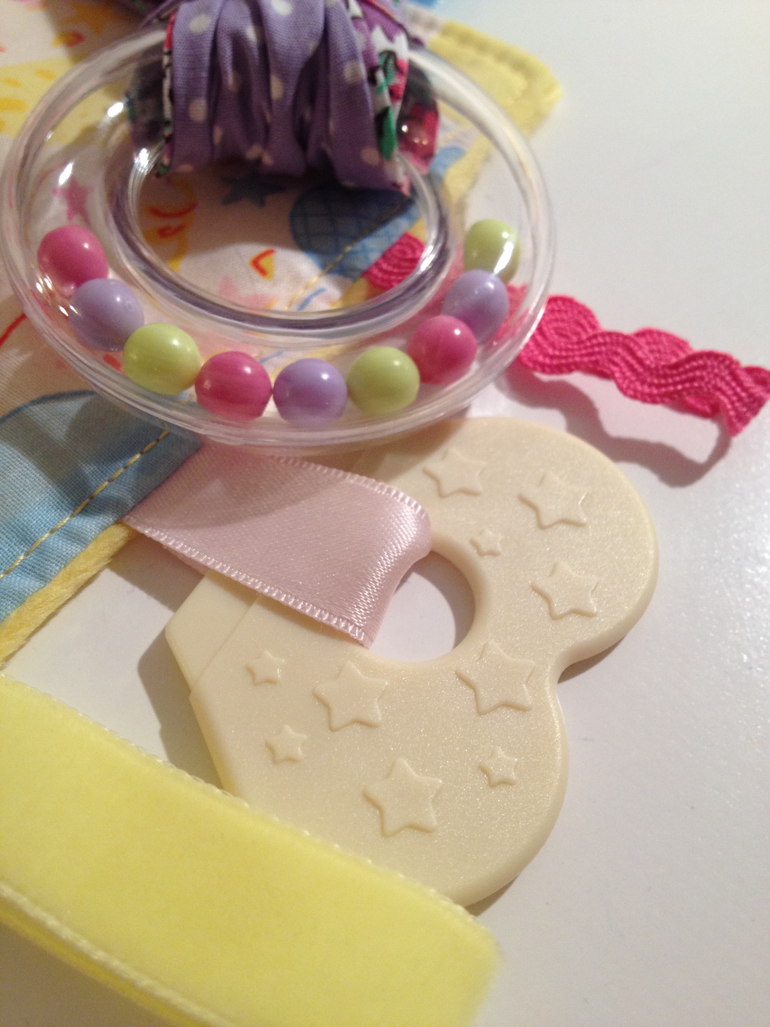 J’ai pris tous les rubans que j’avais en stock et je l’ai choisi en fonction de leurs tailles, de leurs matières… Toujours chez Les Moutons de Kallou, j’ai acheté une « nageoire de dentition ». Alix va pouvoir se faire un plaisir d’y faire ses petites quenottes.