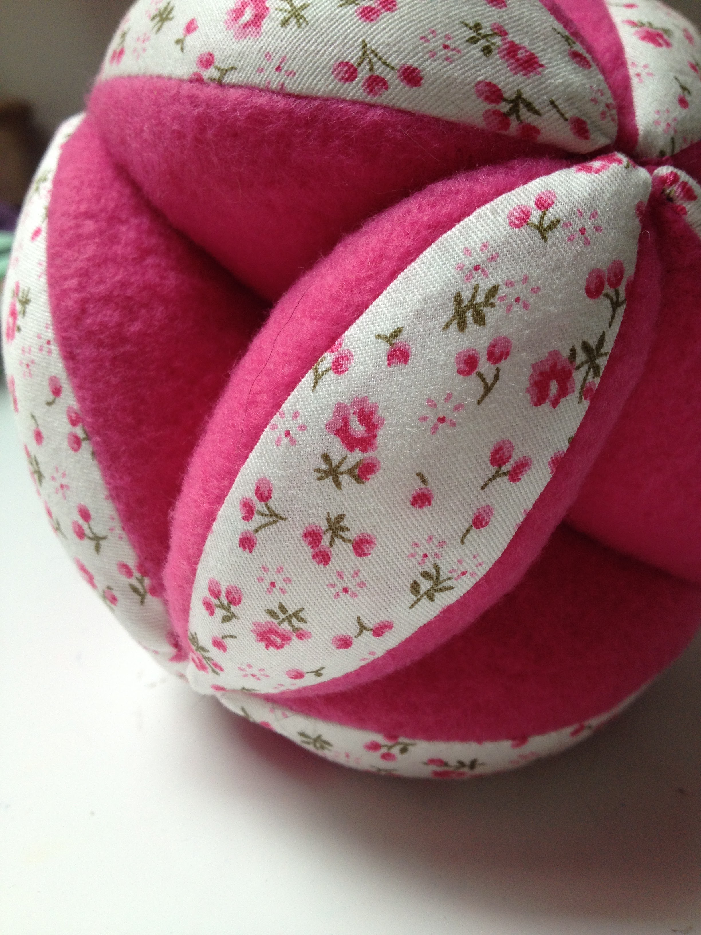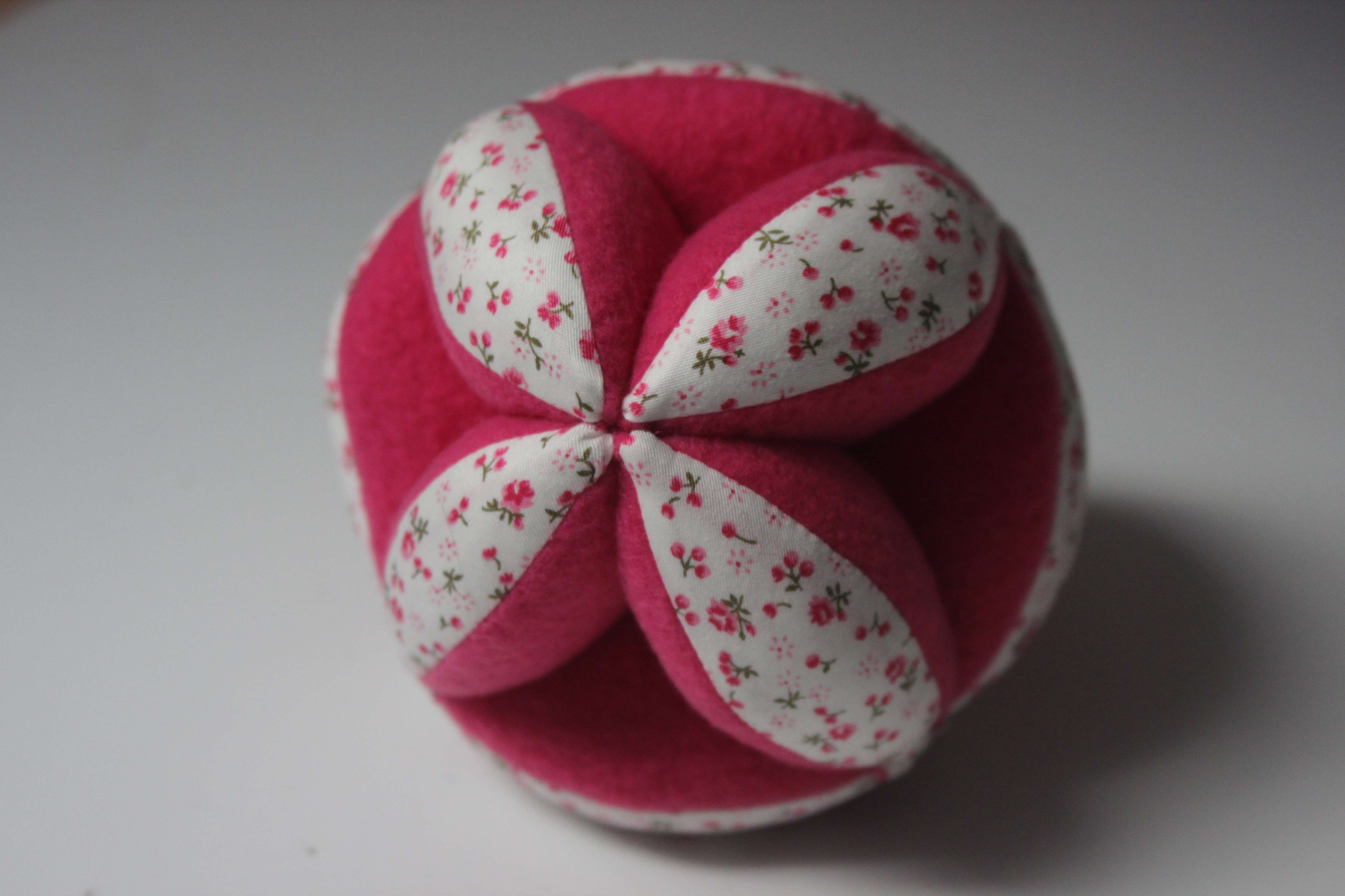 Pour rendre la balle plus attractive pour Alix, j’ai utilisé 2 tissus différents : un coton imprimé et de la polaire.