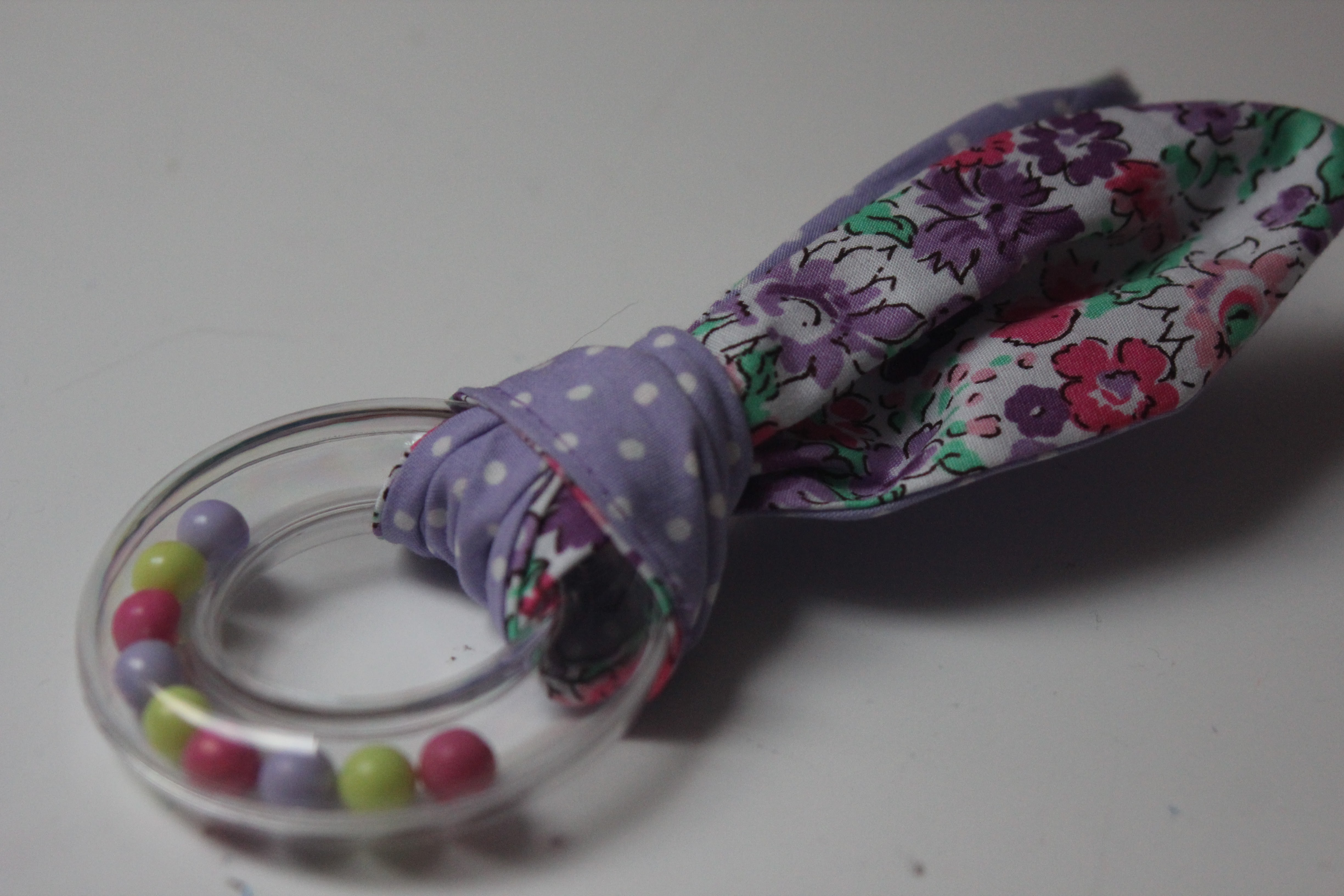 Les tissus sont des coupons que j’ai acheté il y a des années sur Ebay UK. Quitte à avoir un hochet, autant qu’il fasse du bruit, j’ai donc opté pour la version avec les petites billes.