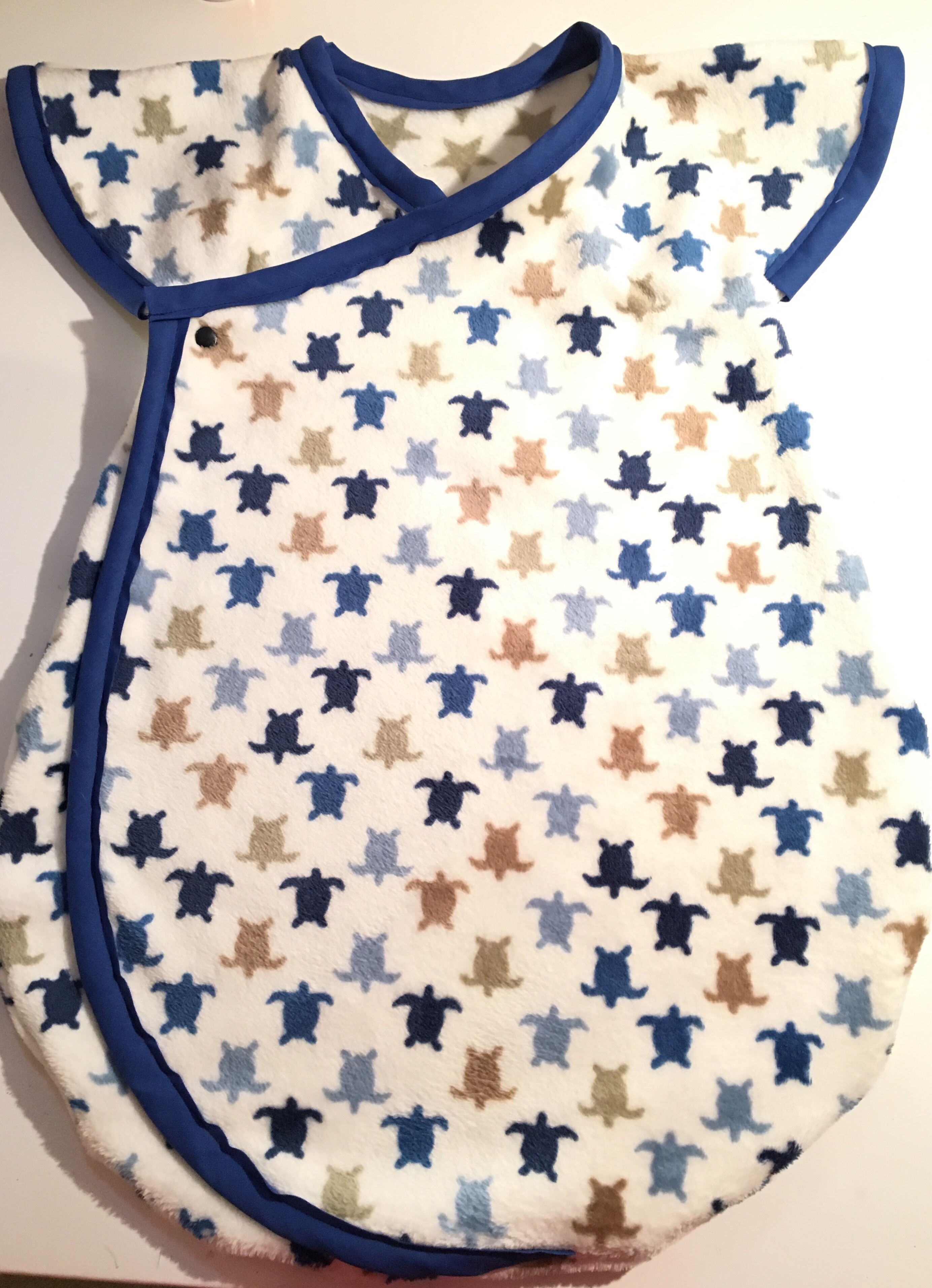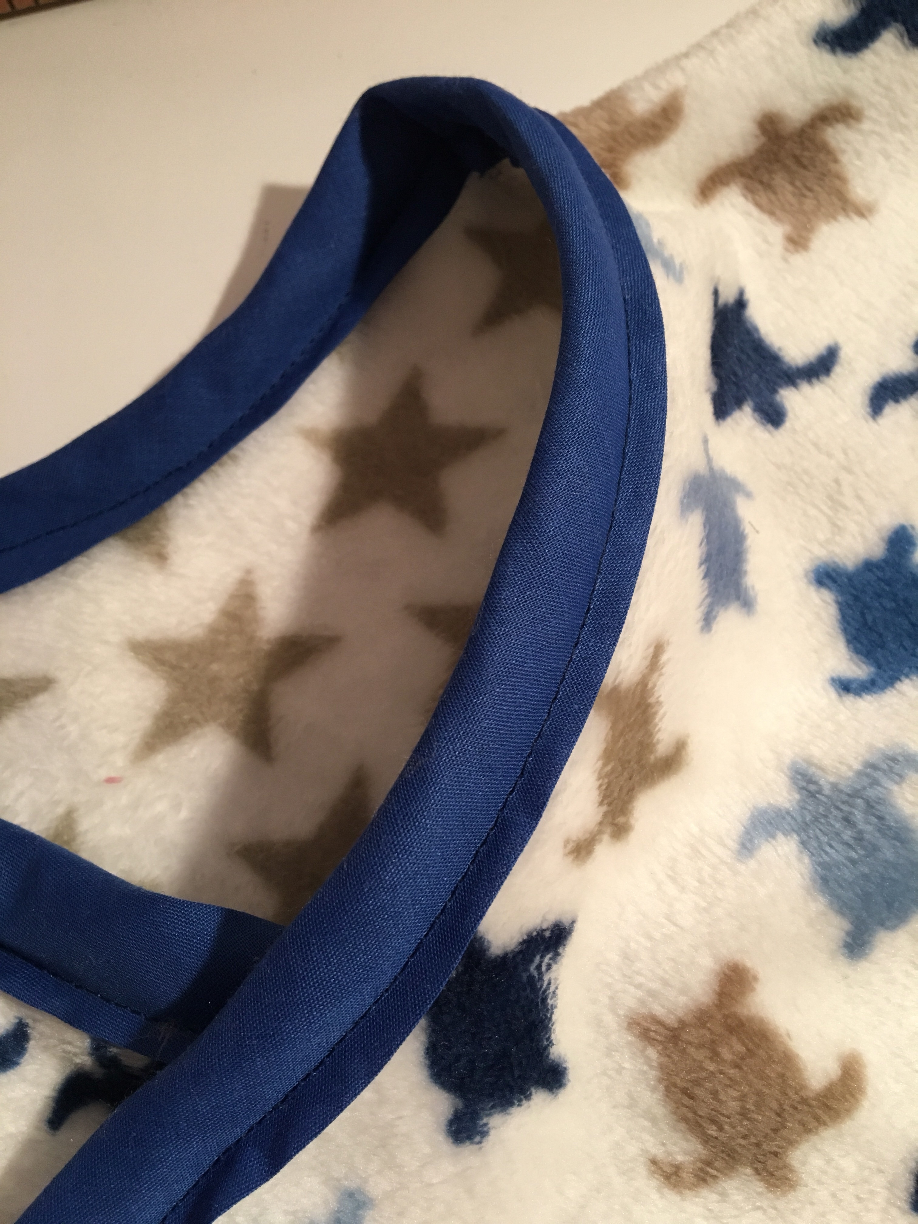 C’est un modèle que je couds beaucoup en ce moment : la turbulette japonisante des Moutons de Kallou (déjà vu ici). Lui aussi est simple à faire et ne demande pas trop de matériel. J’ai du acheté du biais parce que j’ai beaucoup de couleurs mais bien sûr pas de bleu marine… Cela m’a permis de découvrir que Rascol en avant de différentes largeurs ! Alors pour tester j’ai pris 4 cm de large !!! Et ben j’aime bien, ça finit super bien la gigoteuse et ça change du fin que l’on peut trouver habituellement. Comme pour la précédente, j’ai posé des pressions Kam directement dans le tissu.