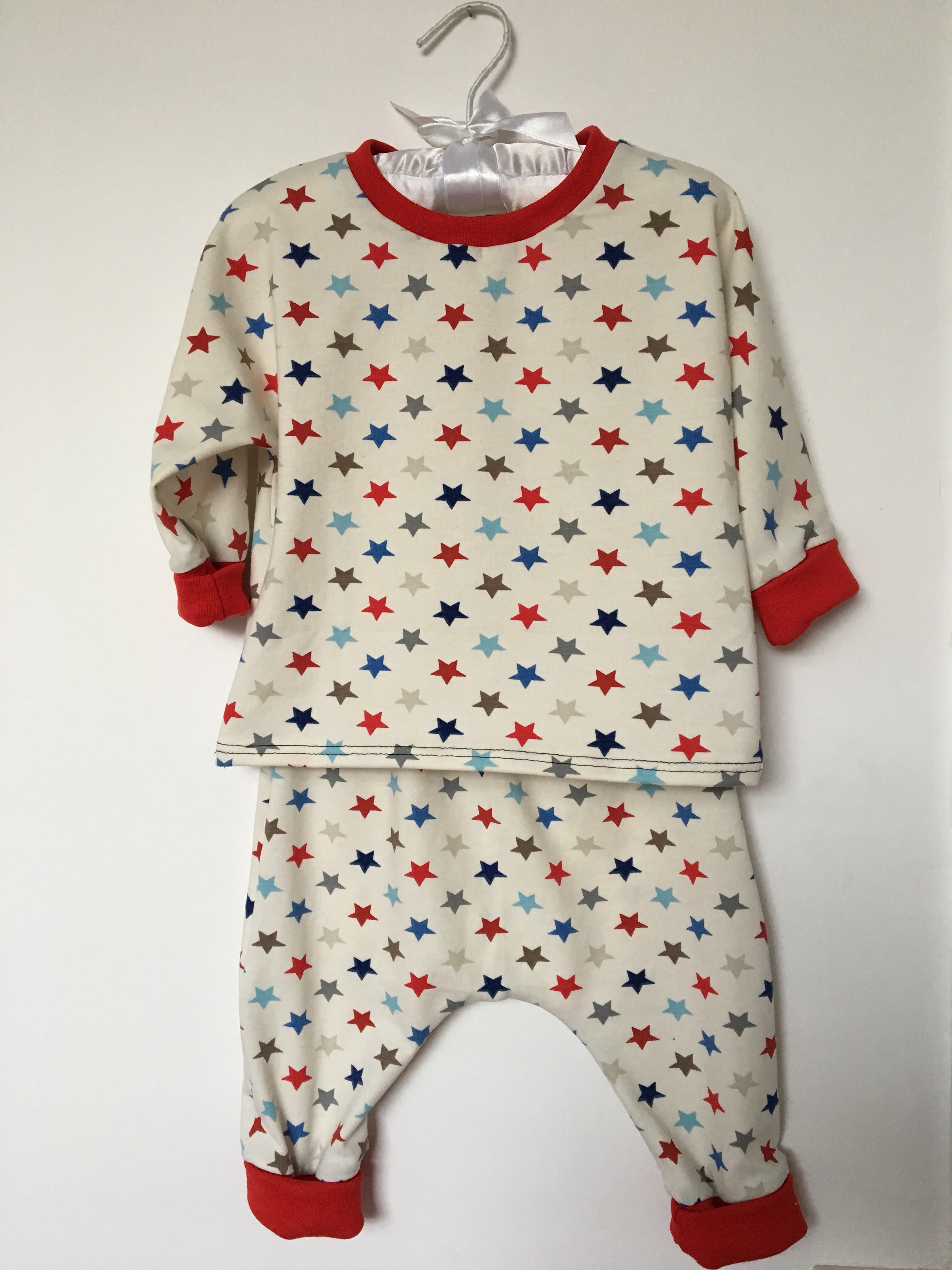 J’ai pas mal cousu, et lui ai fait une panoplie. Lors de ma dernière virée chez Bennytex (à la base pour faire du repérage pour les costumes du spectacle de danse de ma puce), je n’ai pas pu résister à l’appel des superbes jersey à l’entrée de l’entrepôt, ni aux tissus doudous coordonnés.