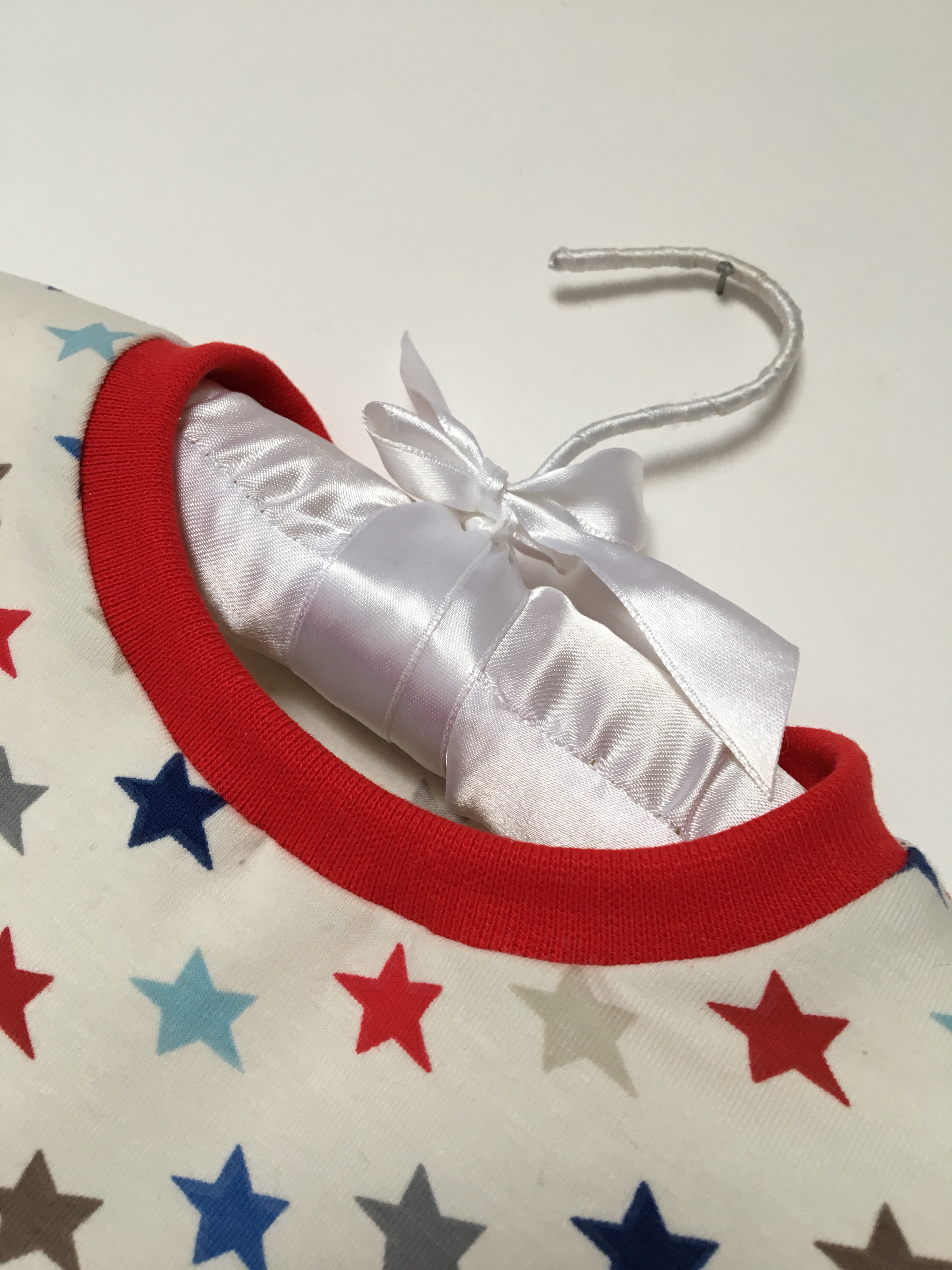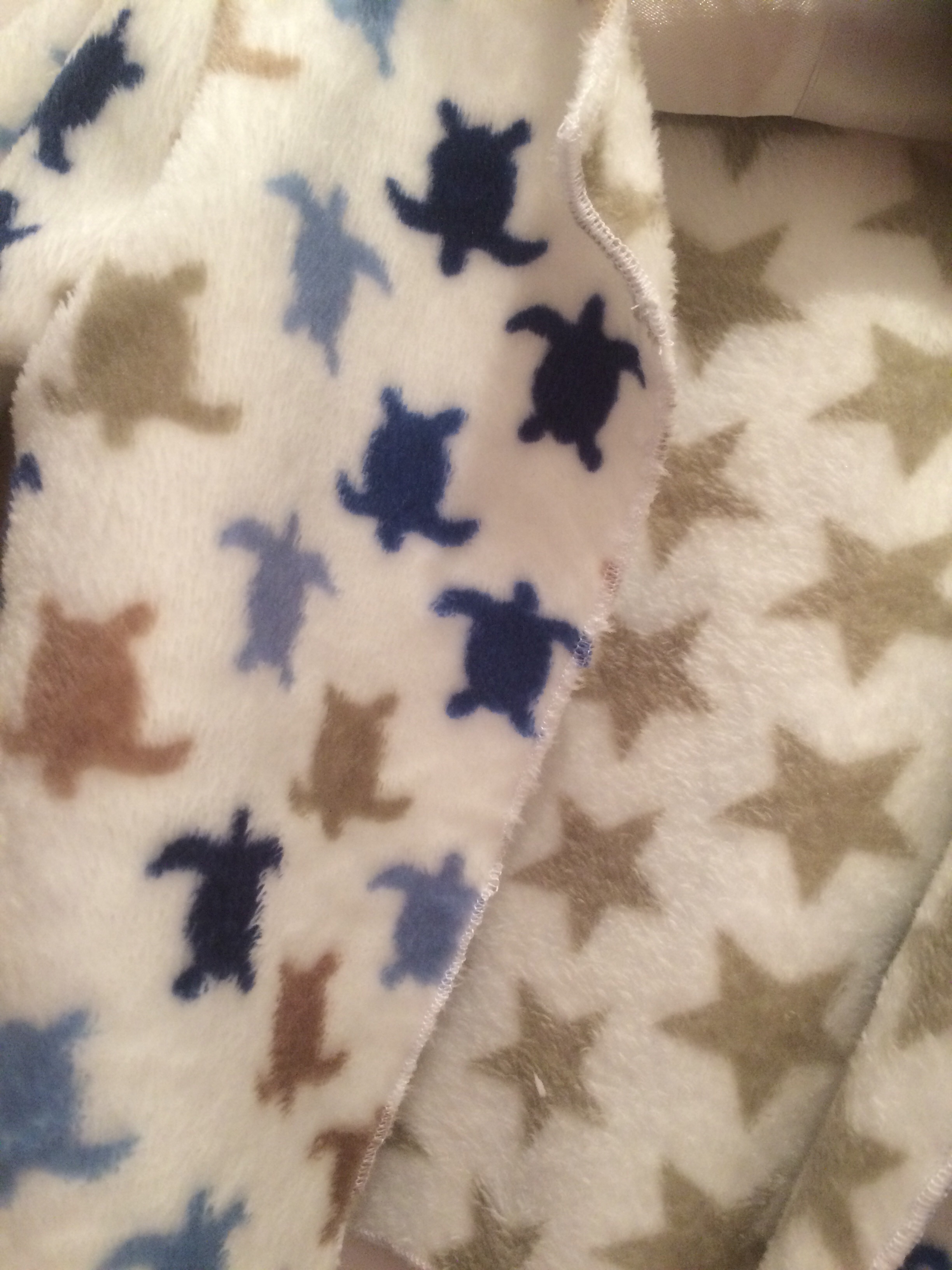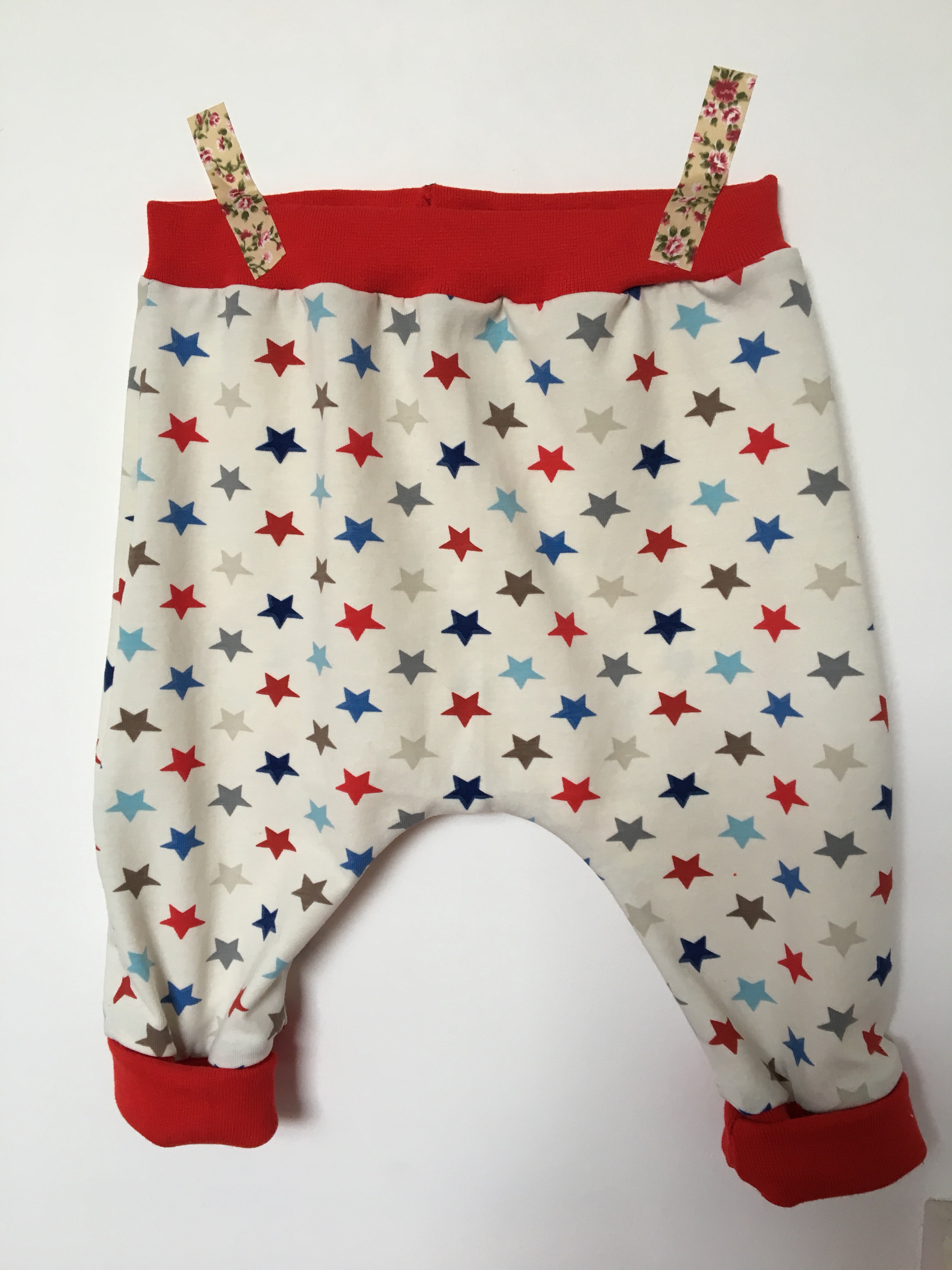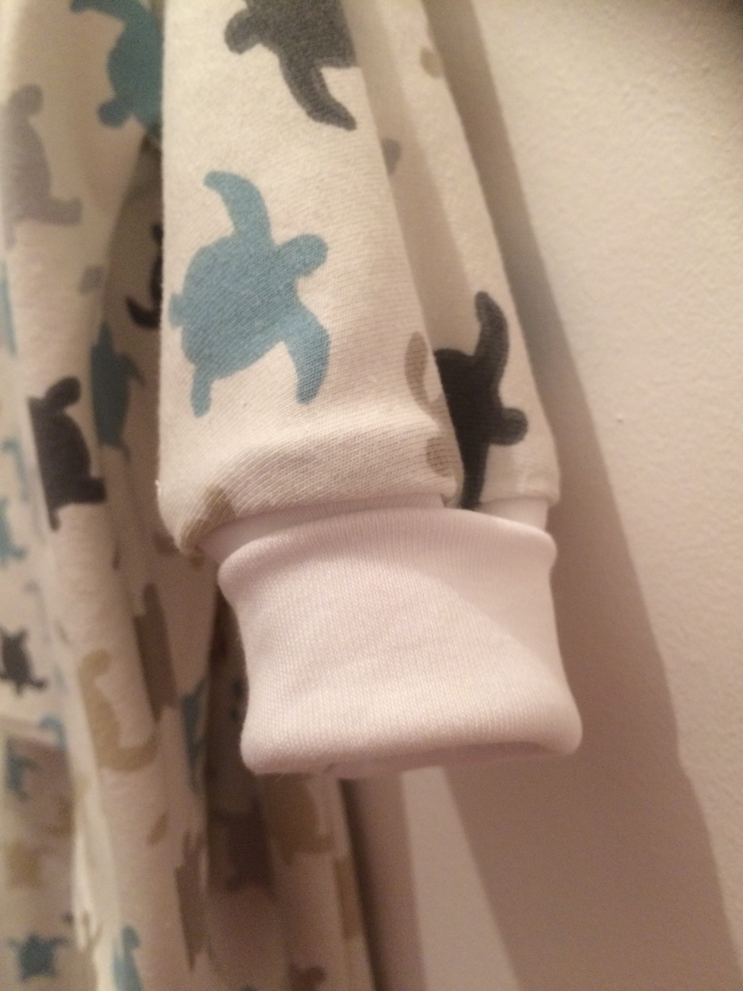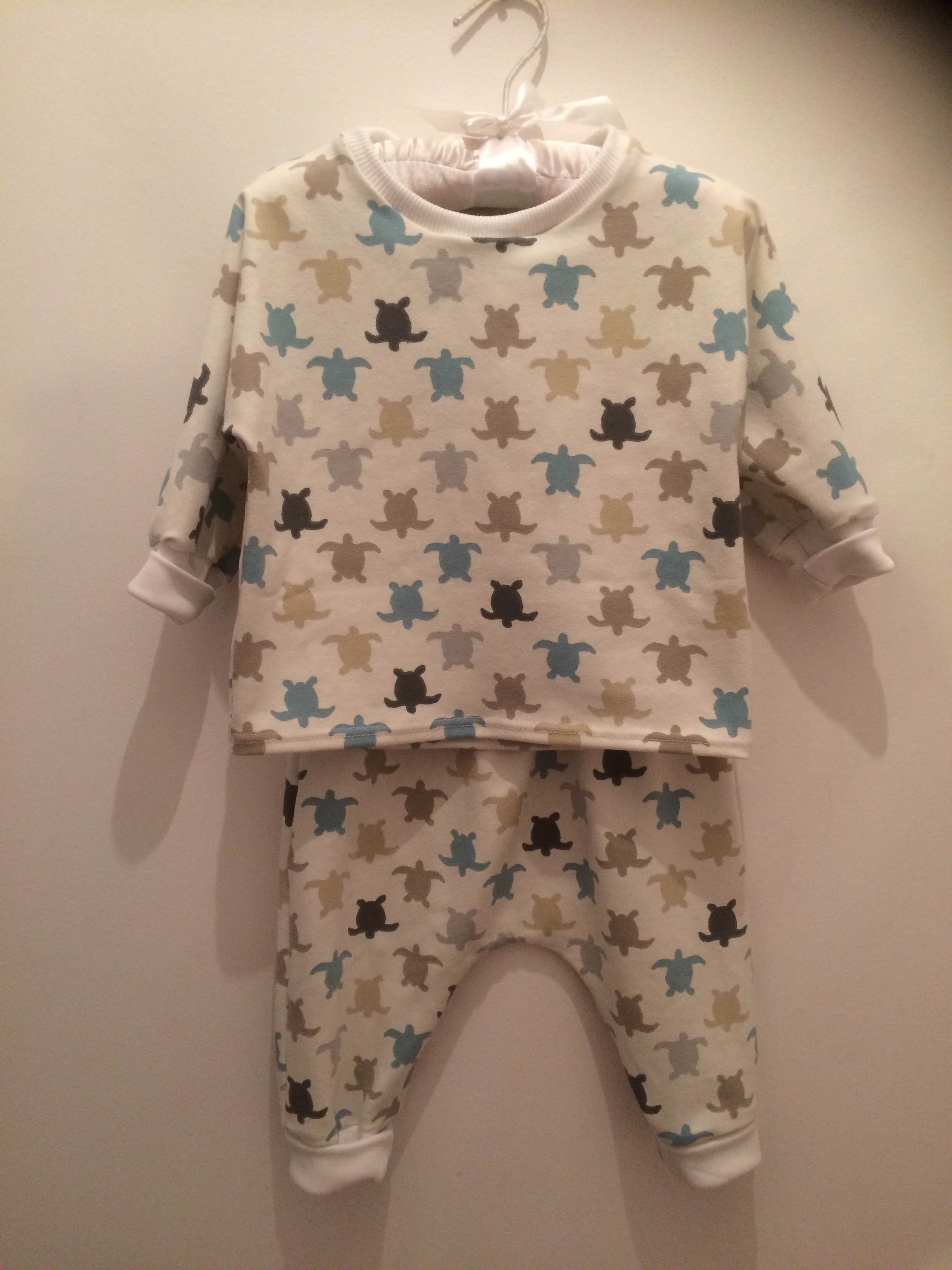 Je ne cousais pas de vêtements quand ma puce est née, je n’avais donc aucun patron pour bébé. J’ai farfouillé et je me suis souvenue que Ikatee en faisait. Nous n’avons jamais assez de pyjamas à cet âge et lorsque j’aime un modèle, j’en fais vite une production industrielle ! Si vous cherchez un modèle pour vous lancer dans le jersey, et que vous avez des bébés/enfants dans votre entourage, c’est le modèle qu’il vous faut ! Il va du 1 mois au 4 ans (je me dis qu’il peut même faire du préma au 5/6 ans en redessinant le patron), il est très bien expliqué, il n’y a aucune surprise, et est vraiment simple à coudre. En plus on peut jouer avec les couleurs du bord-côte pour le personnaliser encore plus. Je trouve un peu terne le pyjama avec les tortues mais le bord-côte bleu que j’avais n’allait pas et je n’avais plus le temps d’en commander (en plus je me suis trompée dans le sens du tissu et les bracelets de poignets et de chevilles étaient tous serrés serrés ! Je ne vous raconte pas comment j’ai serré les fesses au moment de recouper dans le peu qu’il me restait !!!).