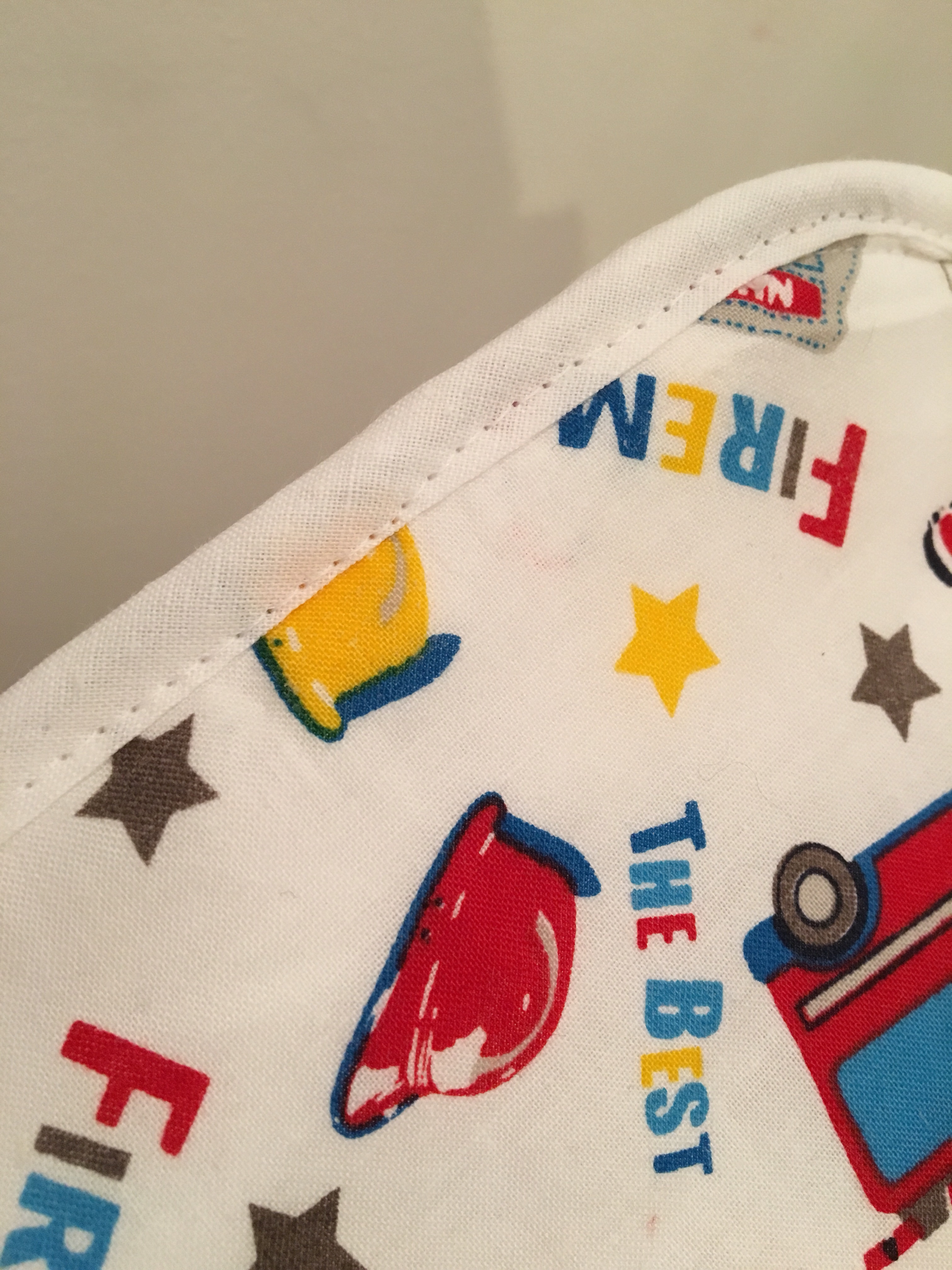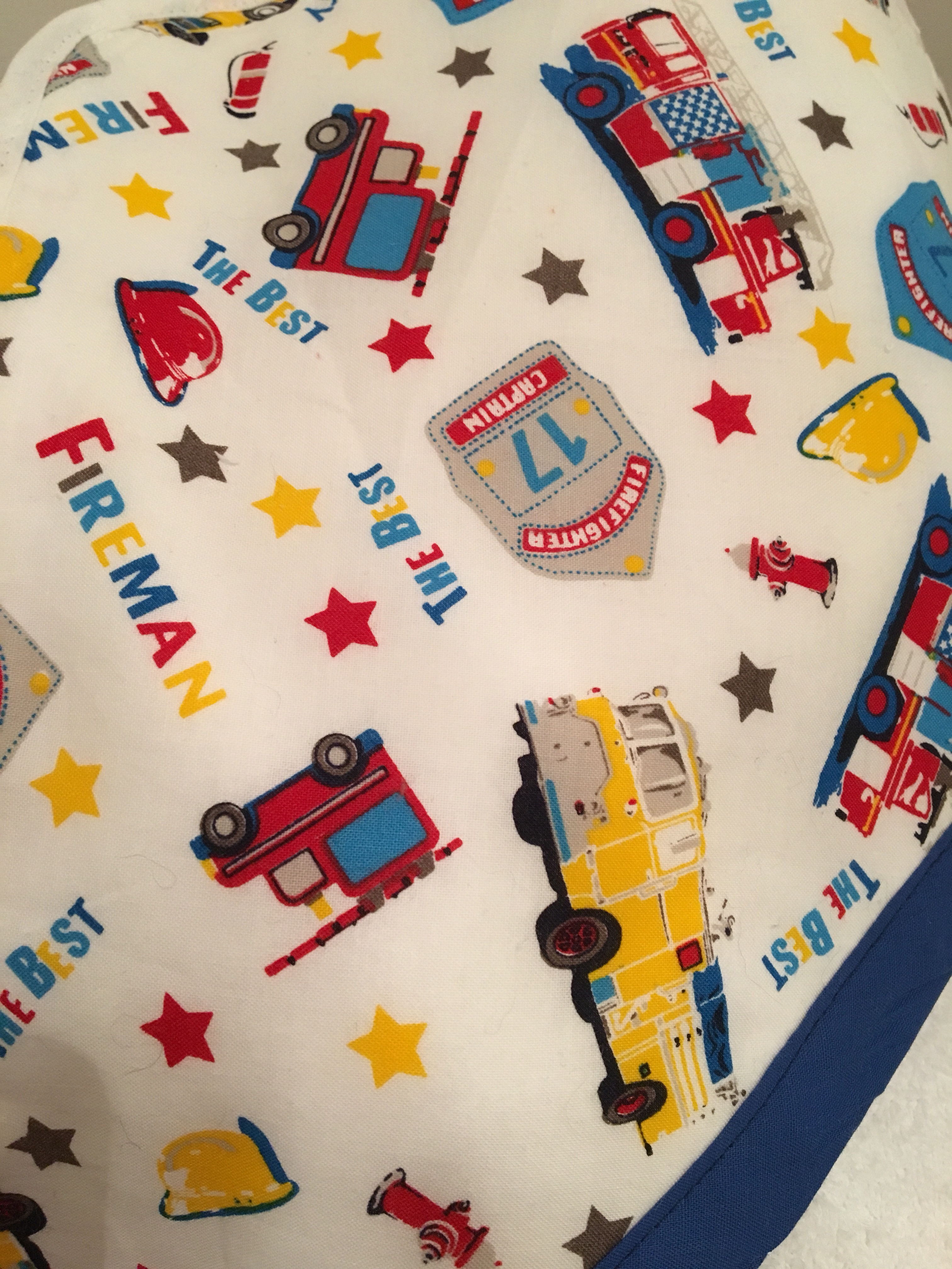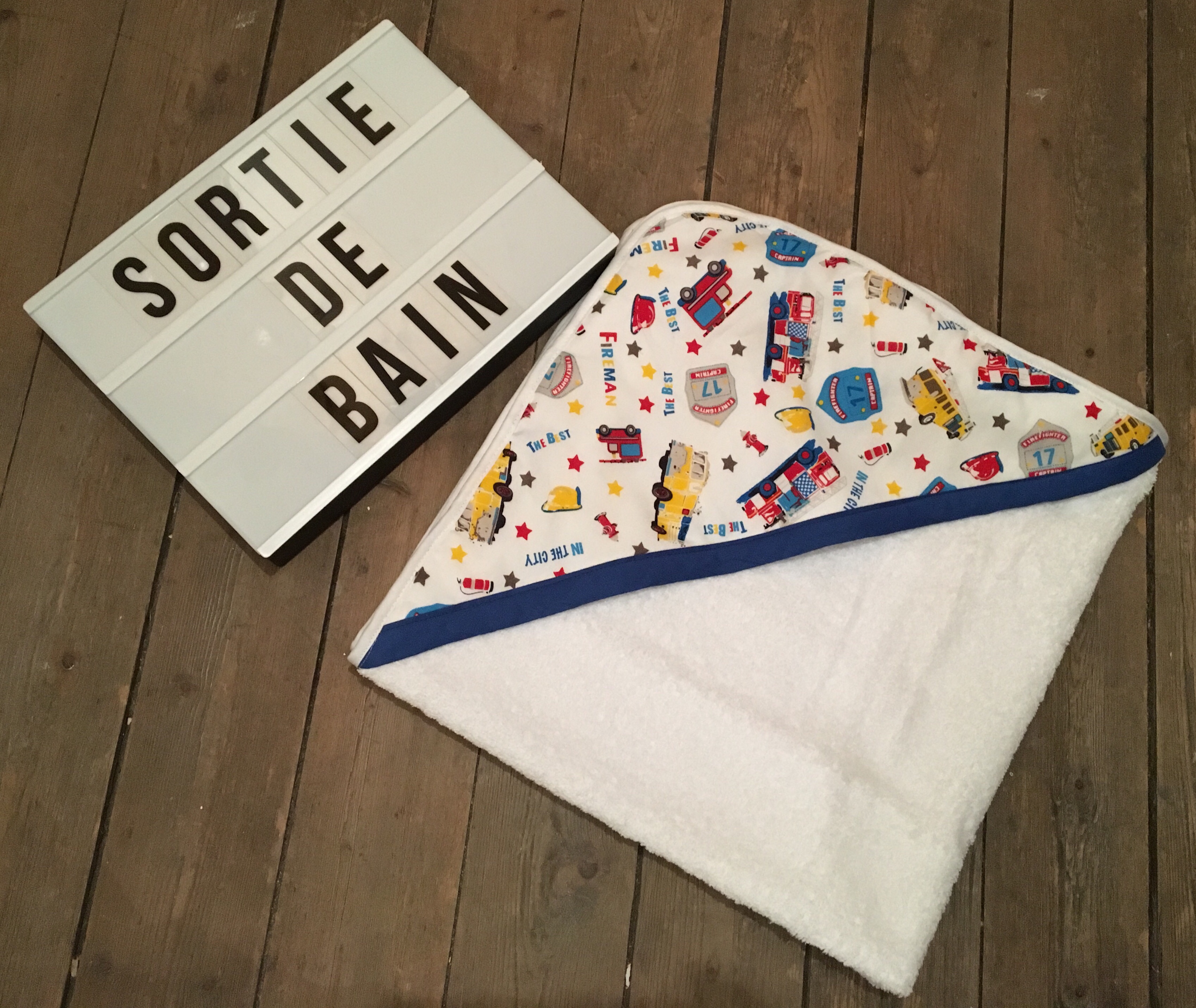 J’en ai déjà cousu une il y a un moment pour la naissance du fils d’un de mes collègues. J’avais glané quelques idées sur le net mais je trouvais les dimensions un peu petites à mon goût. Une fois le principe compris, il est facile de modifier les dimensions. La mienne fait 80 x 80cm. Autant vous dire qu’un nouveau-né se perd dedans mais au-moins elle dure longtemps (mon collègue s’en est servi jusqu’au 2 ans de son fils) donc est vite rentabilisée ! Pour le tissu, n’est pas neveu de pompier qui veut, quand j’ai vu cette chute sur mes étagères j’ai immédiatement pensé à la sortie de bain. Il y a des évidences parfois… N’ayant pas assez de biais bleu (si j’avais su à la commande !!!), je n’en ai mis que sur la capuche et j’ai tout simplement mis du blanc sur le pourtour. Un autre cadeau rapide à faire et qui fait son effet.