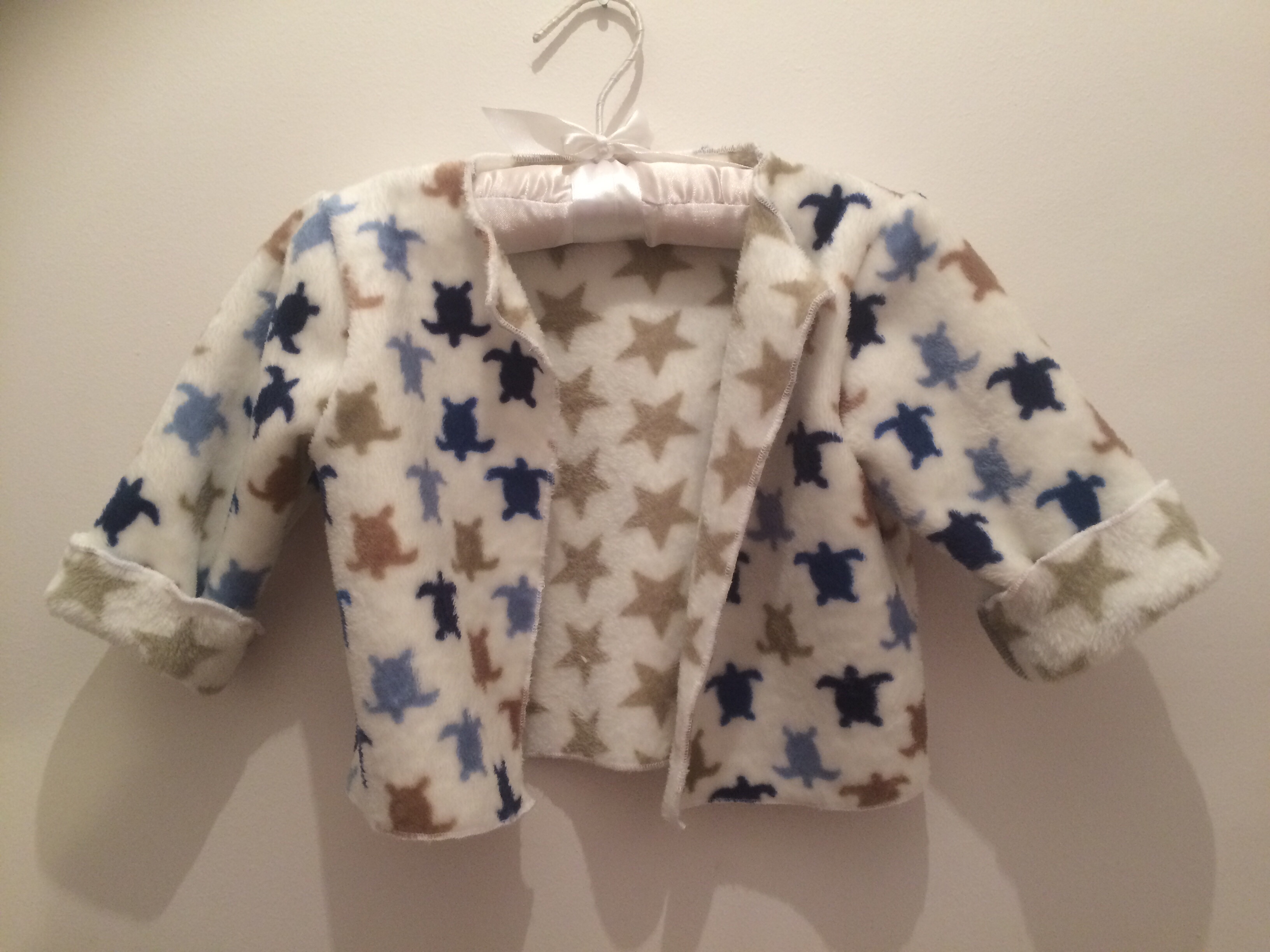 J’ai pris le tuto de gilet de France Duval-Stalla, que j’ai coupé en 6 mois (il va du 3 au 18 mois). Le tuto est on-ne-peut-plus-simple. Normalement le gilet est réversible mais comme mon tissu l’était déjà, cette version n’était pas nécessaire. J’ai longuement hésité pour les finitions, et j’ai finalement opté pour un roulotté tout simple.