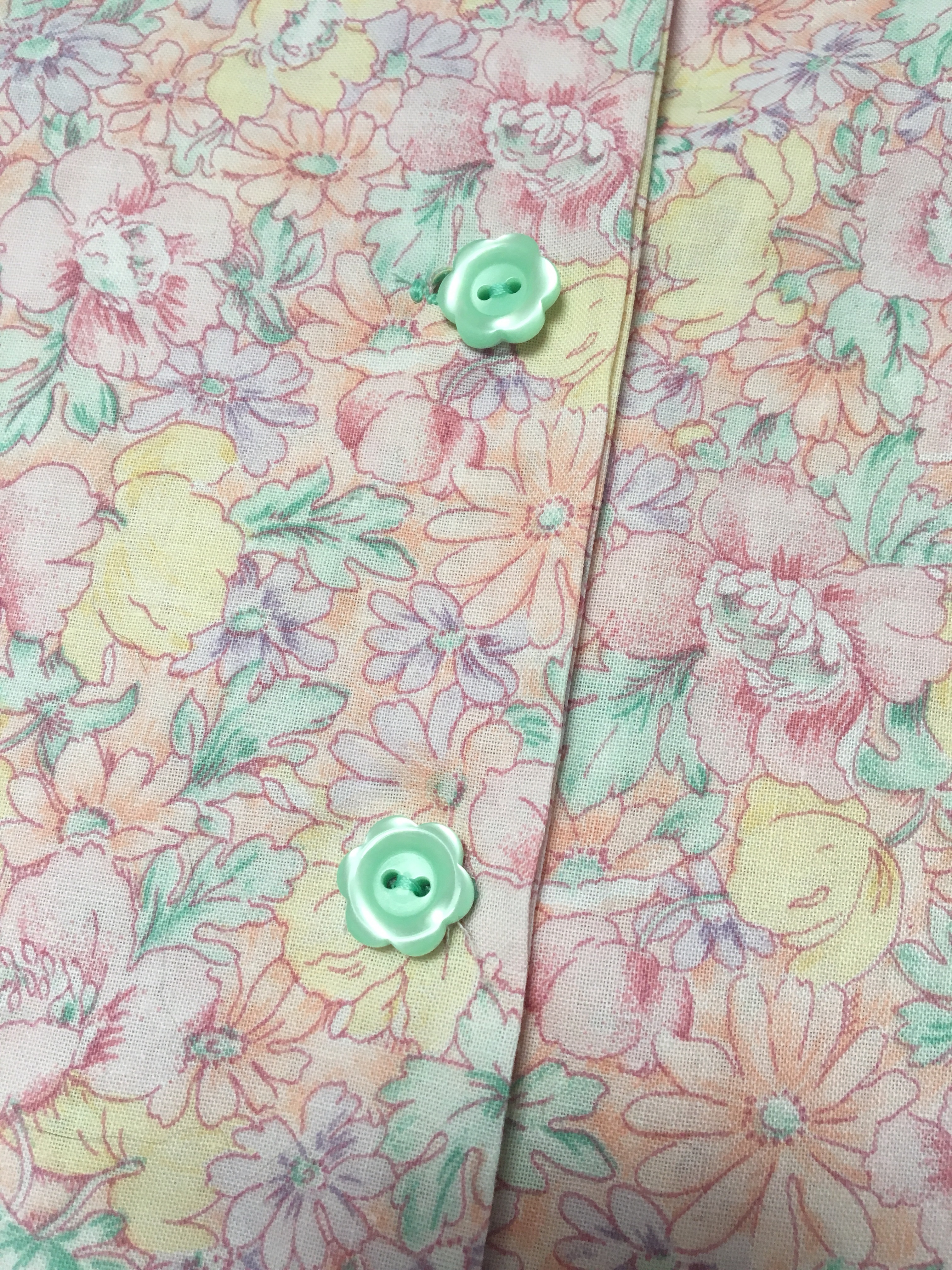 Les boutons viennent de la mercerie proche de mon lieu de travail. Entre la couleur et la forme, j’ai trouvé qu’ils s’associaient parfaitement avec le motif du tissu.