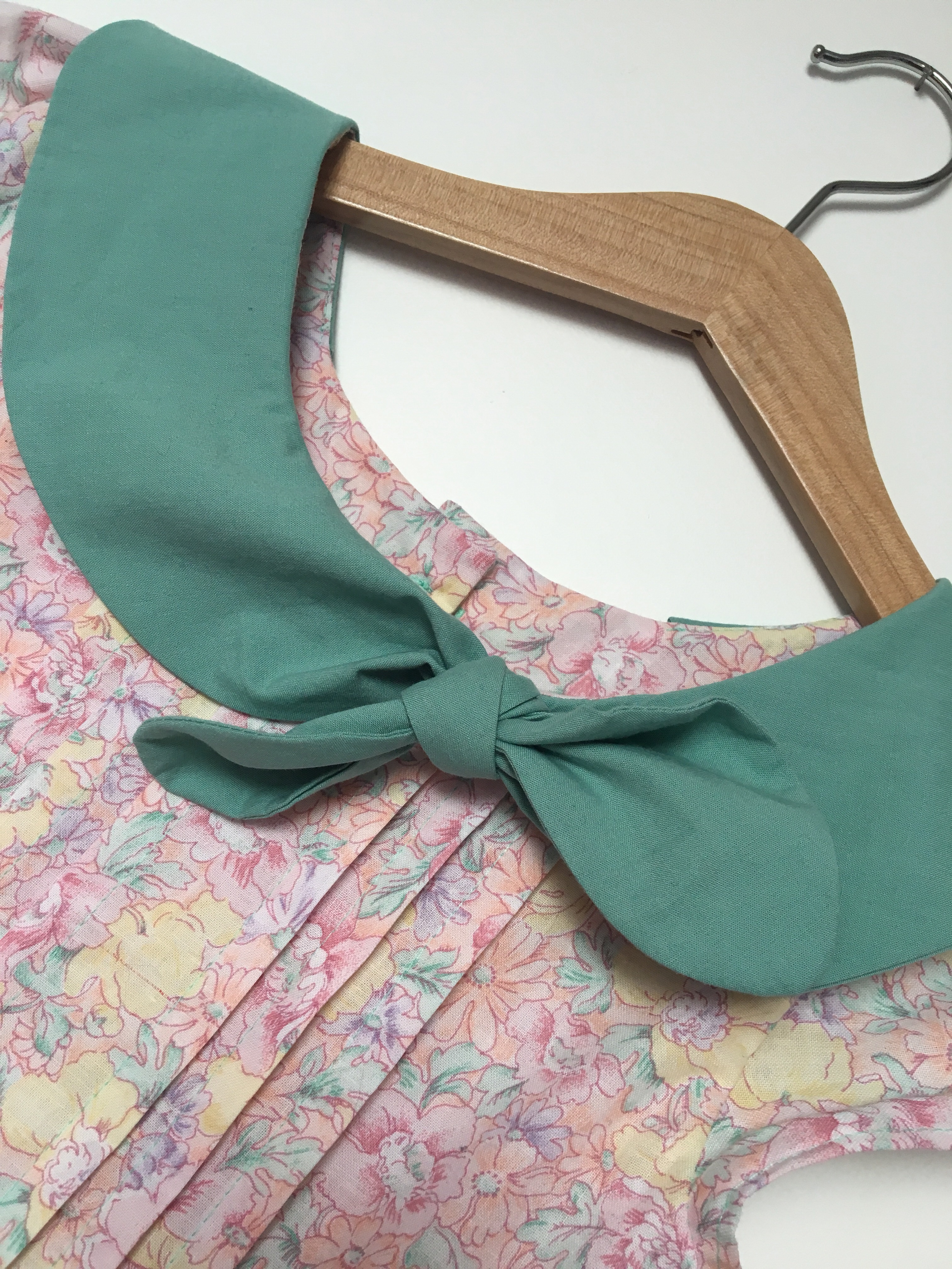 C’est ma tante des USA qui m’a offert le tissu. Initialement, je le réservais pour un autre modèle mais parfois tout s’imbrique et cela devient une évidence. Le tissu vert aussi était réservé pour un autre modèle (à vrai dire le même que le tissu fleuri), lui vient d’un coupon des Coupons de Saint-Pierre utilisé pour une autre robe.